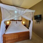 Located on the upper floor, this exquisite suite offers a perfect blend of privacy, comfort, and natural beauty. The interior features a magnificent handcrafted wooden king-size bed, draped with a stylish mosquito net and premium white linens for an atmosphere of pure relaxation.